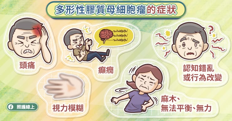 有些患者的頭痛是慢慢出現,不甚明確;有些頭痛則來的突然,甚至還伴隨著癲癇,肢體痙攣抽搐。另外,隨著生長位置不同,膠質母細胞瘤亦會帶來行為、情緒、思考改變,更難以溝通,或身體出現麻木、無法平衡、無力等症狀。