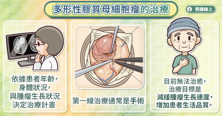 醫師會依據患者的年齡(大於七十歲,或小於七十歲),身體狀況,與腫瘤生長狀況來決定治療計畫。第一線治療通常是手術,需要看腫瘤長的位置來決定手術,而腦部組織負責視覺、運動、語言、或思考等地方,若多形性膠質母細胞瘤長進到腦組織之間,手術可能無法整個清除癌細胞組織,醫師僅能盡最大努力清除最多癌細胞組織。