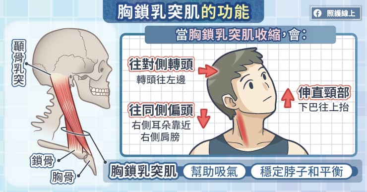 一:往對側轉頭,例如當轉頭往左邊,代表右側的胸鎖乳突肌收縮。