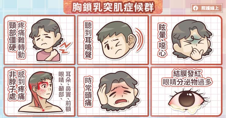胸鎖乳突肌失能的時候,除了造成頸部的不舒服之外,也會表現在其他非頸部的位置。因此胸鎖乳突肌症候群的症狀還挺多樣化的: