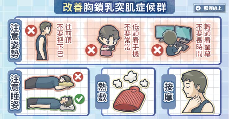 要改變胸鎖乳突肌症候群,還是要找到原因。你可以先檢查一下,自己是否常常姿勢不良,如果是的話,最好隨時隨地提醒自己要注意姿勢,不要把下巴往前頂,不要常常低頭看手機,並調整工作時桌子、螢幕、手繪板等的角度,讓自己不用長期低頭、偏頭、或轉頭。
