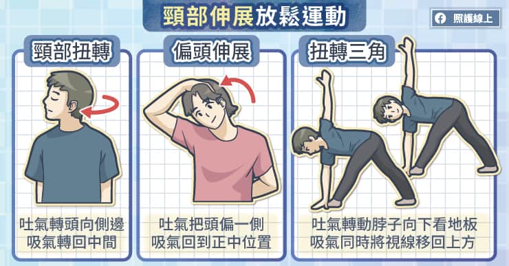 局部的熱敷和按摩可以暫時改善一些頸部的緊繃不適,但如果你已經長期有這些狀況,還是要配合物理治療,並利用放鬆技巧,瑜珈,深呼吸,冥想等方式減輕生活壓力。平時在家或在工作的空檔,都可以做一些簡易的頸部伸展放鬆運動,回復肌筋膜的平穩。