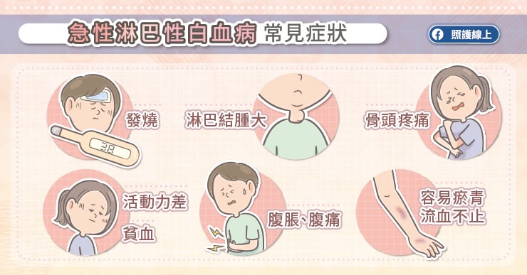 急性淋巴性白血病是源自淋巴細胞的血癌,可能影響正常血球的生成,而造成各種症狀,如臉色蒼白、疲倦虛弱、容易瘀青、流血不止、不明原因發燒,也會導致淋巴結腫大、肝臟腫大、脾臟腫大、骨頭疼痛等。