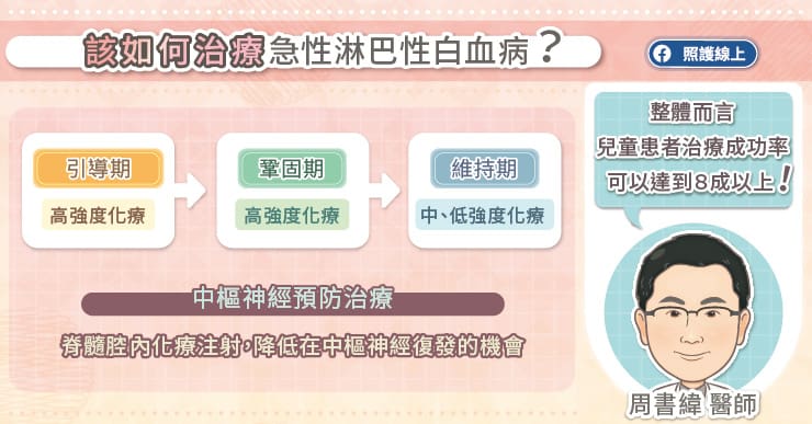 急性淋巴性白血病的化學治療包括三個階段:引導期、鞏固期、維持期。此外,周書緯醫師說,針對中樞神經預防治療也相當重要,因為急性淋巴性白血病是種容易進到中樞神經系統的疾病,所以除了全身性化學治療之外,在療程中也會去檢查病人的腦脊髓液裡是否有癌細胞,且在檢查同時把化學治療注入脊髓腔內,進行治療或預防在白血病在中樞神經復發。