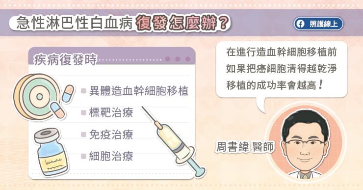 急性淋巴性白血病復發的患者需要考慮異體造血幹細胞移植(骨髓移植),周書緯醫師解釋,在造血幹細胞移植前可以利用化學治療或免疫治療,盡量消滅急性淋巴性白血病的癌細胞,若能把癌細胞清得越乾淨,移植的成功率會越高。