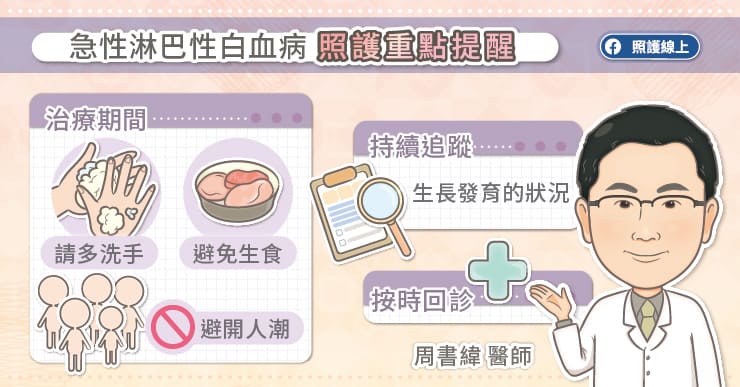 接受化學治療的過程中,患者的免疫力會比較差,請多洗手、避免生食、避開人潮,以減少遭到感染的機會。完成治療後,醫師也會持續追蹤兒童的生長發育。