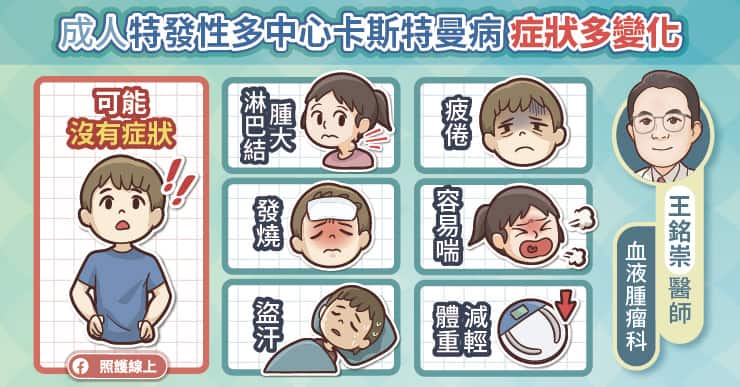 特發性多中心卡斯特曼病(iMCD)的症狀主要是多處淋巴結腫大,可能伴隨發燒、盜汗、疲倦、體重減輕等症狀,較嚴重時還會出現貧血、腎功能惡化、肝脾腫大、肺部積水、肋膜積水、下肢水腫等。王銘崇醫師說,若有相關症狀,可至血液腫瘤科就診,以確定診斷。