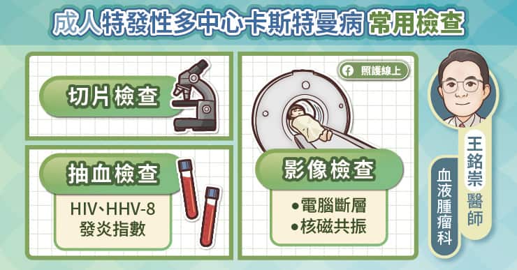 抽血檢查的部分會驗人類免疫缺乏病毒(HIV,human immunodeficiency virus)、人類疱疹病毒第8型(HHV-8,human herpesvirus 8),看看有沒有感染這些病毒。王銘崇醫師說,如果沒有HIV、HHV-8,就是所謂的「特發性」。另外,會使用影像學檢查,例如電腦斷層、核磁共振等,如果有多處淋巴結腫大,就是所謂的「多中心」。