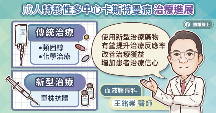 特發性多中心卡斯特曼病(iMCD)的傳統治療是類固醇與化學治療,王銘崇醫師說,現在已有針對可抑制過多細胞激素介白素-6(IL-6,Interleukin-6)單株抗體可以運用,積極接受治療能夠幫助改善症狀,穩定病情!