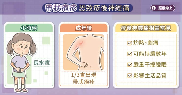 帶狀疱疹除了會讓皮膚冒出水泡、破皮,還會造成相當嚴重的神經痛,患者可能感到灼熱、刺痛、感覺異常,而干擾睡眠、影響生活品質。持續不斷的神經痛會造成憂鬱,甚至重度憂鬱症,非常煎熬。