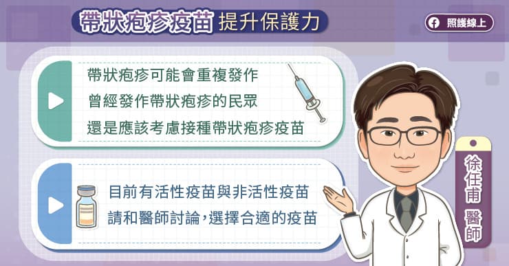 活性帶狀疱疹疫苗採皮下注射1劑,非活性帶狀疱疹疫苗採肌肉注射2劑,間隔2至6個月。徐任甫醫師建議,「由於帶狀疱疹可能重複發作,所以曾經發作帶狀疱疹的民眾,還是應該考慮接種帶狀疱疹疫苗。」