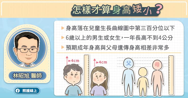 身高過於矮小,可能對孩子的心理、社交造成負面影響。在兒童成長過程中,照顧者要定期紀錄生長曲線,才能提早發現身高矮小的狀況,把握治療時機。林昭旭醫師解釋,目前對於身高矮小的定義有兩個,第一個是長得很矮,身高落在兒童生長曲線圖中第三百分位以下〔7〕。第二個就是成長速率緩慢,6歲以上的男生或女生,一年長高不到4公分〔8〕。
