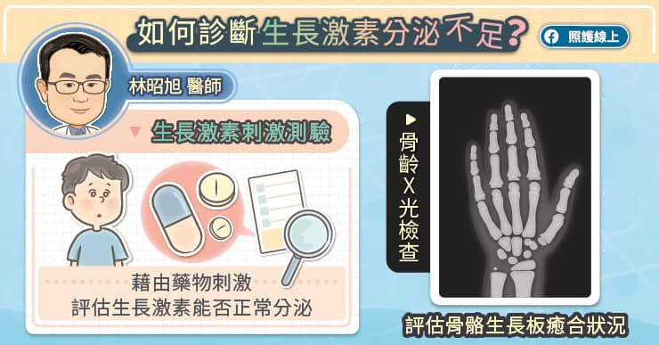 為了確定診斷生長激素缺乏症,會安排住院進行生長激素刺激測驗〔11〕。林昭旭醫師說明,我們體內的生長激素是脈衝式分泌,因此得藉由藥物刺激,評估生長激素能否正常分泌。若發現有生長激素缺乏的狀況,病人可諮詢專科醫師,進行相關檢查與治療。