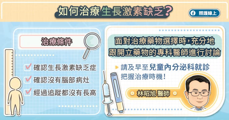 經過詳細檢查與專科醫師的評估,若確認生長激素缺乏症、沒有腦部病灶、且經過追蹤都沒有長高,面對治療藥物選擇時,充分地跟開立藥物的專科醫師進行討論。林昭旭醫師提醒,在骨骼生長板癒合之後,便沒辦法再長高,請務必及早至兒童內分泌科檢查,把握治療時機,幫助孩子順利成長!
