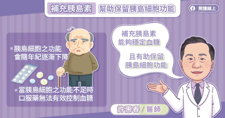及早補充胰島素,有助於保留胰島細胞的功能。許惠春醫師說,胰島素治療能讓胰島細胞休息,也能讓血糖控制更穩定。