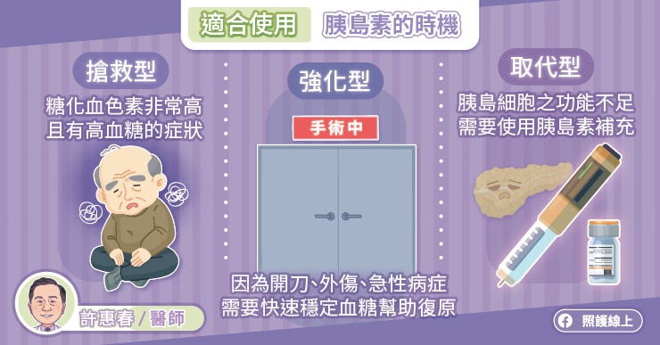 胰島素是人體不可或缺的荷爾蒙,需要補充胰島素的時機大概有幾種。許惠春醫師說,第一種是「搶救型」胰島素治療,當患者初診斷糖尿病,糖化血色素HbA1c過高,也許高達9%、10%,甚至11%以上,同時合併有高血糖的症狀,例如多吃、多喝、多尿、體重減輕等,便需要積極使用胰島素治療,快速把血糖控制下來。這類治療期通常是1至3個月,待患者的血糖穩定以後,就有機會停針,改成單純的口服降血糖藥繼續治療。