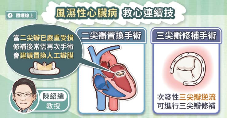 風濕性心臟病患者的二尖瓣往往都嚴重發炎、鈣化,若採用二尖瓣修補術,未來需要再次開刀的機會較高。陳紹緯醫師說,目前大多會建議進行二尖瓣置換手術,移除病變的二尖瓣,換上人工瓣膜。65歲以上患者,一般建議用生物瓣膜,65歲以下患者,如果願意終身使用抗凝血劑,可考慮使用機械瓣膜降低二次開刀風險。