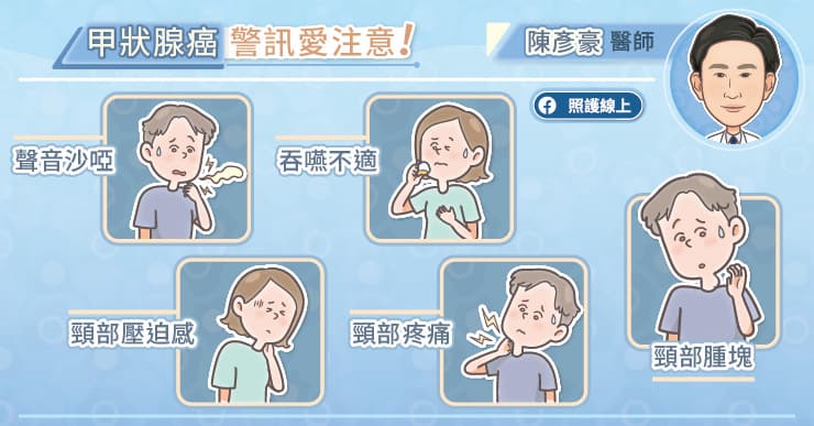 甲狀腺癌是內分泌系統常見的癌症,生長速度較慢,但是可能侵犯氣管、壓迫食道,而影響進食、說話與呼吸。陳彥豪醫師提醒,若有發現頸部腫塊、頸部疼痛、吞嚥困難、聲音沙啞等狀況,要盡快就醫檢查。