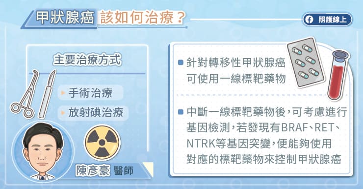陳彥豪醫師表示,針對能夠使用手術切除的甲狀腺癌,可採用手術合併放射碘治療(I-131)。針對有轉移且對放射碘治療有抗性的甲狀腺癌時,則必須考慮進行全身系統性治療。