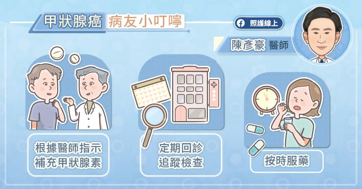 接受甲狀腺癌治療後,很多病人需要定期服用甲狀腺素。而因為甲狀腺素的吸收容易受到其他食物或藥物影響,所以會建議病友在早上空腹時服藥,經過1個小時後再吃東西或服用其他藥物。除了按時服藥之外,也必須定期回診追蹤檢查以評估疾病控制的狀況。