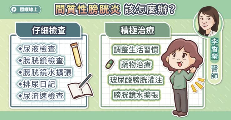 要診斷間質性膀胱炎,一定要先排除其他的疾病,例如泌尿道感染、膀胱癌等問題。李香瑩醫師說,通常會驗尿、做膀胱鏡檢查,看看是否有細菌感染或罹癌的可能性。