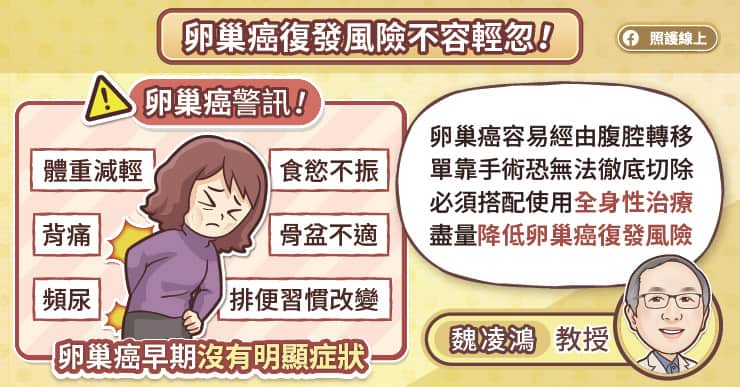1、 卵巢癌初期沒有症狀,且容易經由腹腔轉移,接受治療後仍有較高的復發風險。
