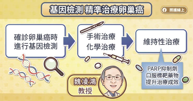 「建議在確診卵巢癌後,便要進行基因檢測,了解腫瘤的基因型態。」魏凌鴻醫師呼籲,「患者一定要與醫師詳細討論,根據基因型態,擬定合適的治療計畫!」