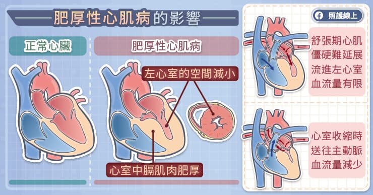 肥厚型心肌病是種因為心臟肌肉的變化而帶來的問題。通常是因為基因體顯性遺傳,影響了肌小節的肌纖維排列,導致心臟肌肉變得肥厚,尤其是左心室與右心室之間分隔的心肌最容易出現肥厚變化。除了心肌變肥厚,還會讓左心室變得僵硬、延展性小,因此帶來不少問題。