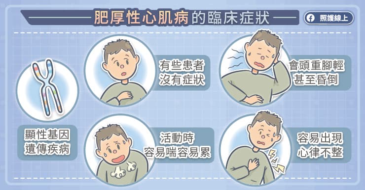 許多患者並不知道自己有肥厚型心肌病,因為症狀可能不嚴重,會甚至根本沒有症狀。若有症狀,常常是從青春期之後開始出現。