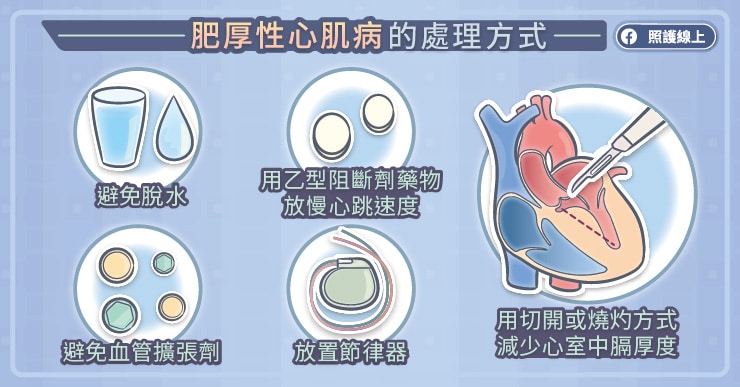 在治療方面,要看患者的臨床症狀與心臟超音波檢查的結果而定。對沒有症狀的患者來說,調整生活習慣,減少劇烈運動活動或許就已足夠。另外一定要讓患者了解,務必「避免脫水」。因為有肥厚型心肌病的時候,進到左心室的血流本身就比較少,若再因為喝的水分不足脫水,在炎熱天氣下脫水,或使用了利尿劑或血管擴張劑,都會讓症狀加劇。