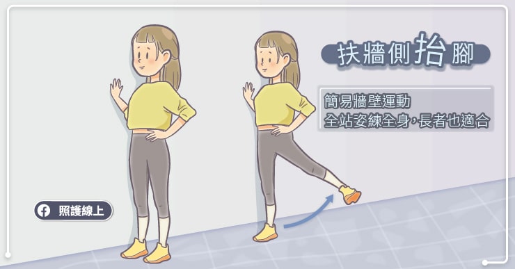 右側邊面對牆壁,以右手扶住牆壁,身體站直,反覆抬起左側腿部,訓練大腿外側的肌力和穩定性。連續抬十至二十次後再換側練習。