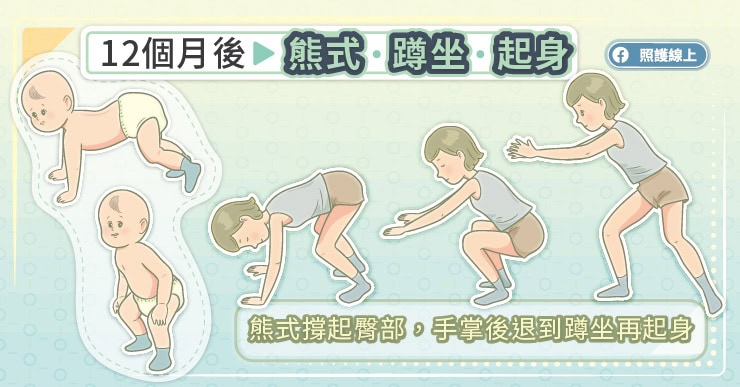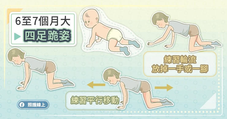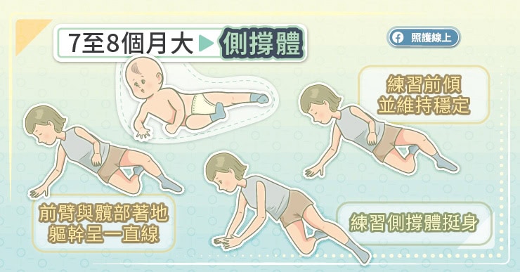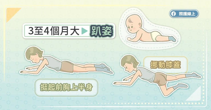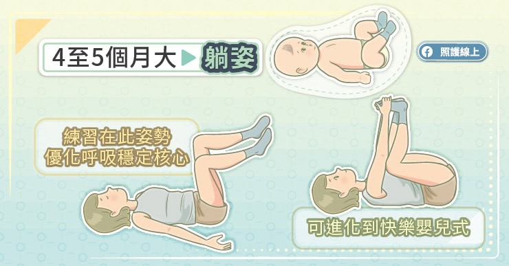 趴姿,這時小寶寶正學會趴著,並撐起頭部。練習者可以試著從趴姿挺起前胸上半身,並活動頸部。