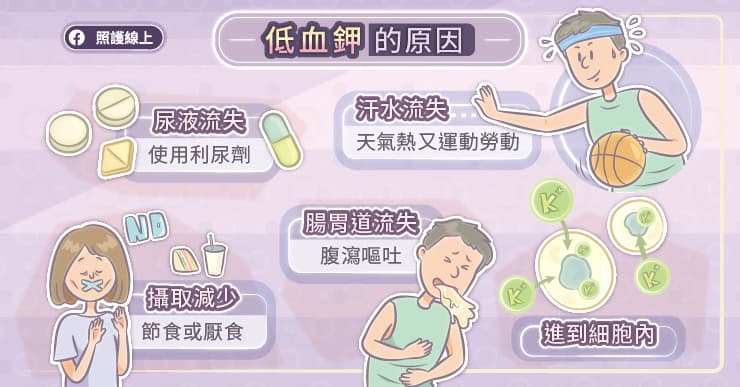 從食物攝取變少,或排出太多,或是鉀離子移動到細胞內,都會導致血鉀降低: