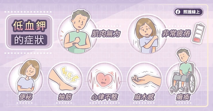 如果只是輕微的低血鉀,不一定會有症狀。只不過,我們的心臟、神經、肌肉要好好工作,都需要鉀離子。因此當血鉀過低的時候,患者出現以下症狀: