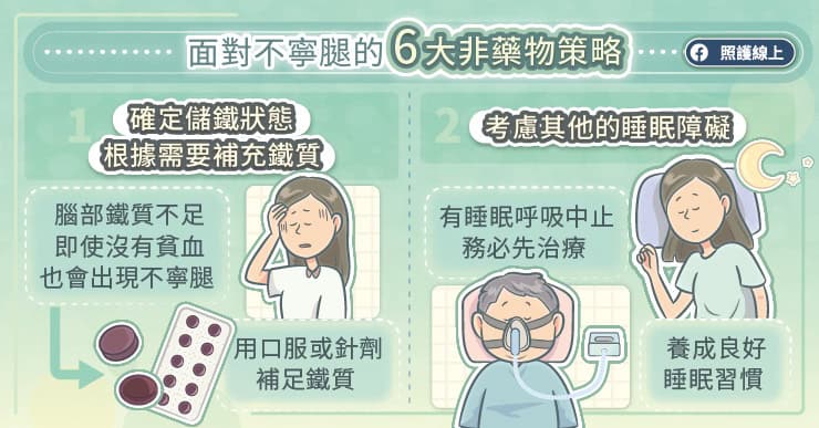當然,所有不寧腿患者都要有好的睡眠習慣,例如養成規律的上床時間,睡前不要吃大餐,午覺少睡一點。