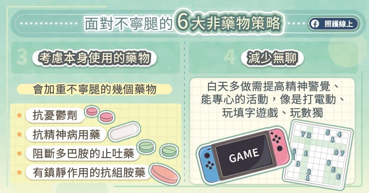 臨床上觀察到若平時比較常進行需要專心的活動,例如打電動、玩填字遊戲、玩數獨,比較不容易患有不寧腿。所以,雖然機轉不明,但不寧腿患者可以試著在清醒時「減少無聊」,多多進行提高精神警覺的活動,讓頭腦有需要專心致力的機會,而不是只是一路放空。如果你偶爾會有不寧腿發作,不要只是放空追劇,不妨專心地做些創作,或多完一些動腦遊戲吧。