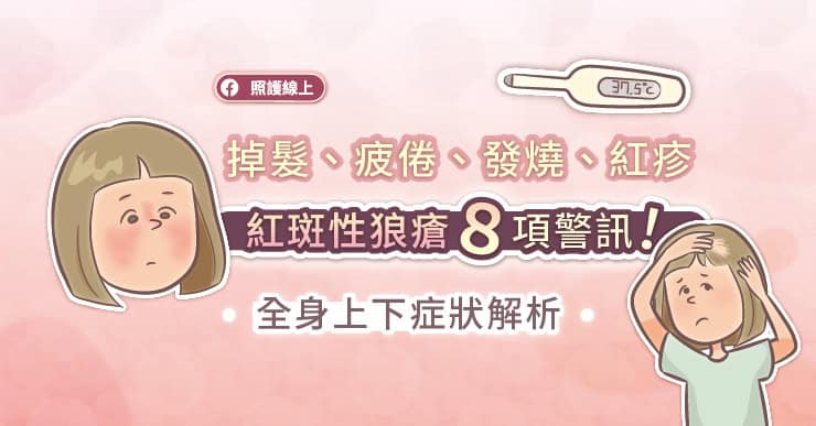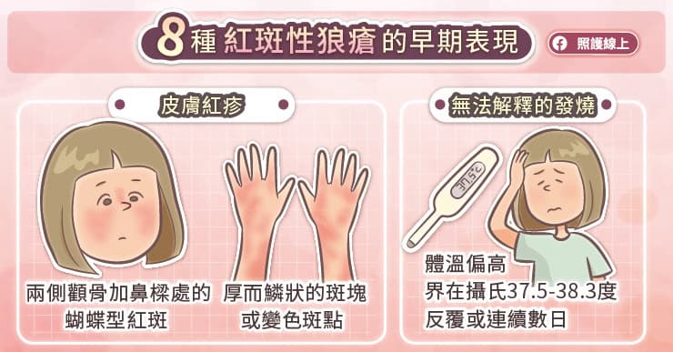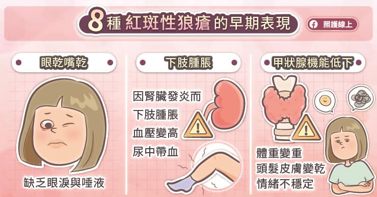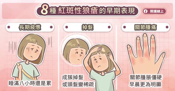 以上八種狀況,包括蝴蝶型紅斑、發燒、疲憊、掉髮、關節腫痛、眼乾嘴乾、下肢腫脹、甲狀腺機能低下,都有可能是紅斑性狼瘡的早期表現。如果生育年齡的女性出現以上多個症狀,務必就醫並好好接受檢查與治療喔。