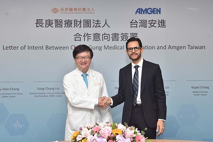 簽署儀式於林口長庚醫院舉行,由長庚醫療財團法人決策委員會主任委員程文俊、長庚醫療體系臨床試驗中心總召集人暨林口長庚紀念醫院副院長林永昌、林口臨床試驗中心主任張毓翰,以及台灣安進總經理韋立格、安進亞太區醫學副總裁Helen Lin、台灣安進醫藥處長張可佩共同簽署及見證。