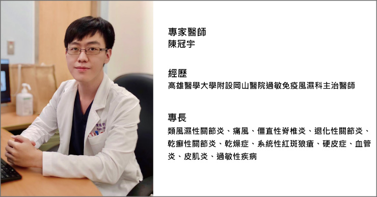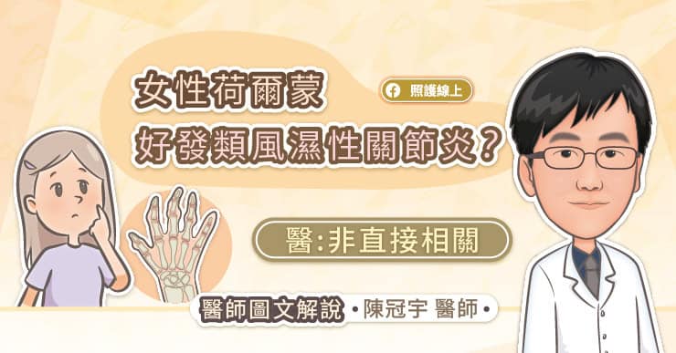 查,果真診斷出來是類風濕性關節炎。所幸在及時的藥物控制下才減緩症狀也避免關節的持續惡化。陳冠宇醫師表示,該名女性來求診時已有備孕計畫,因此在用藥上需要格外留意,他也提醒女性患者有懷孕打算或是已經懷孕期間,都應提早和醫師說明,以免影響受孕情況以及胎兒的健康。