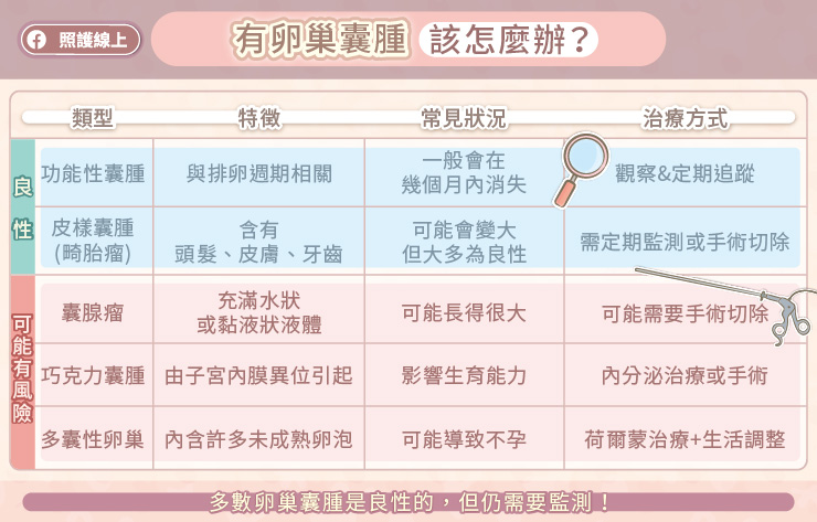 討論卵巢囊腫的治療時,最重要是患者的年紀,是否懷孕,與卵巢囊腫的型態、大小,造成的症狀等因素。