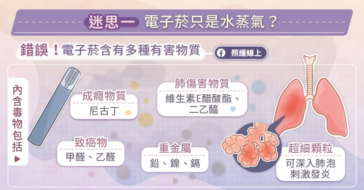 迷思一:電子菸成分單純很多,只是看起來有些煙霧而已