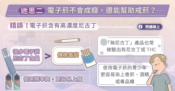迷思二:電子菸不會成癮,想戒菸就要靠電子菸