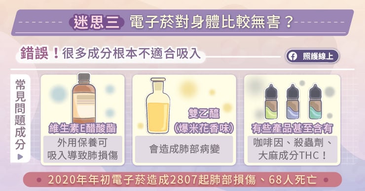 正解:電子菸成分複雜且來源不明,吸入後可能引發嚴重肺部傷害甚至死亡。