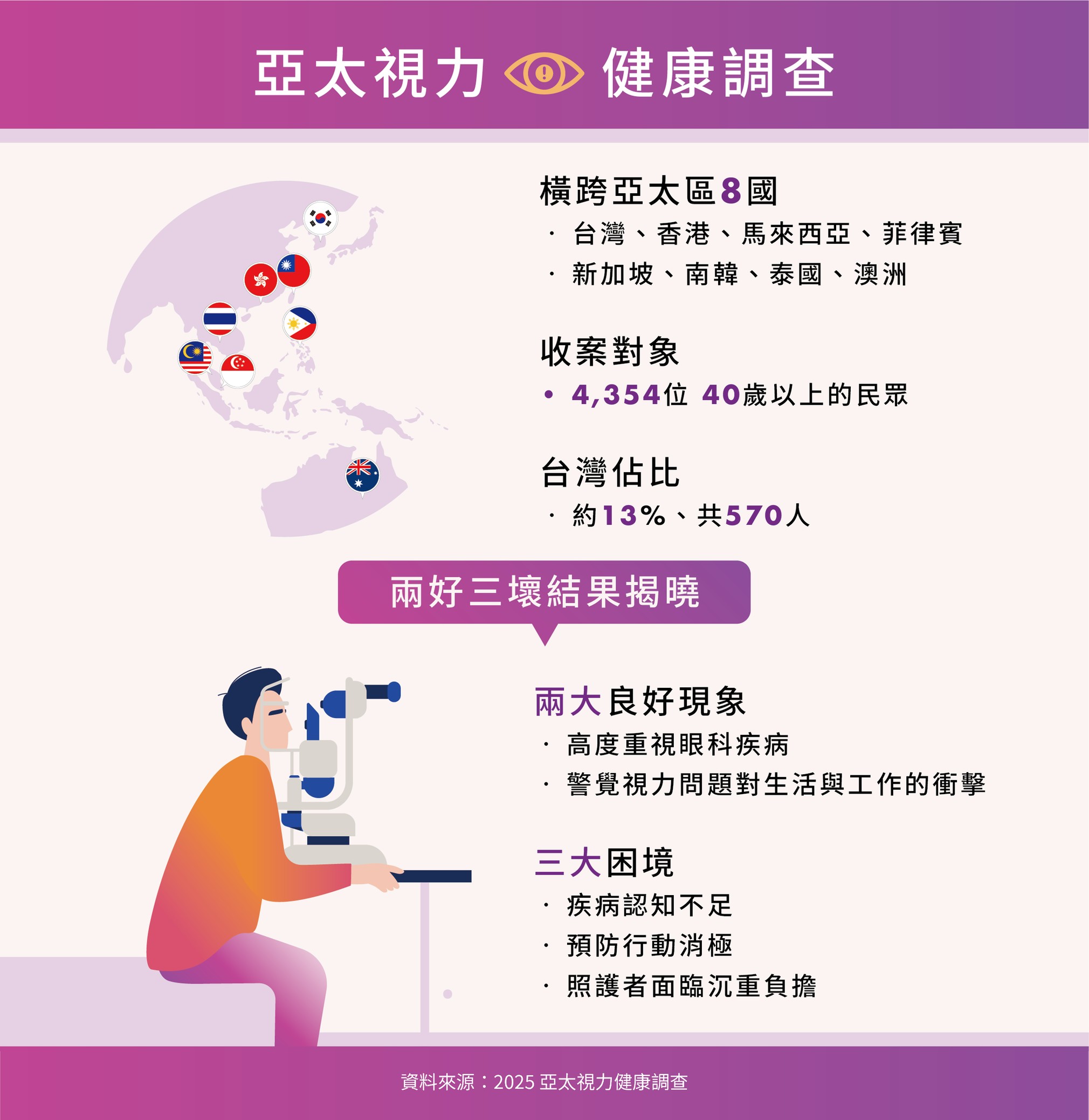 此亞太視力健康調查(APAC Vision Health Survey)於2024年8月至9月期間收案,共蒐集了來自台灣、香港、馬來西亞、菲律賓、新加坡、南韓、泰國、澳洲等八個國家共4,354位40歲以上民眾的認知,其中台灣受訪人數達570人、約佔研究人數的13%。