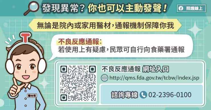 ● 民眾參與守護:居家醫材若有異常,民眾可主動透過網路通報系統或專線(02-2396-0100)反映。