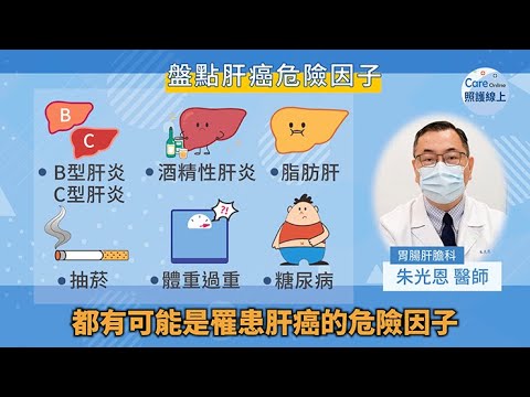 劉育志醫師:大家好,我是劉育志醫師,歡迎胃腸肝膽科的朱光恩醫師來到照護線上。朱光恩醫師:大家好,我是朱光恩醫師。劉育志醫師:請問朱醫師,肝癌的危險因子有哪些?朱光恩醫師:在台灣很多人都有B型肝炎或是C...