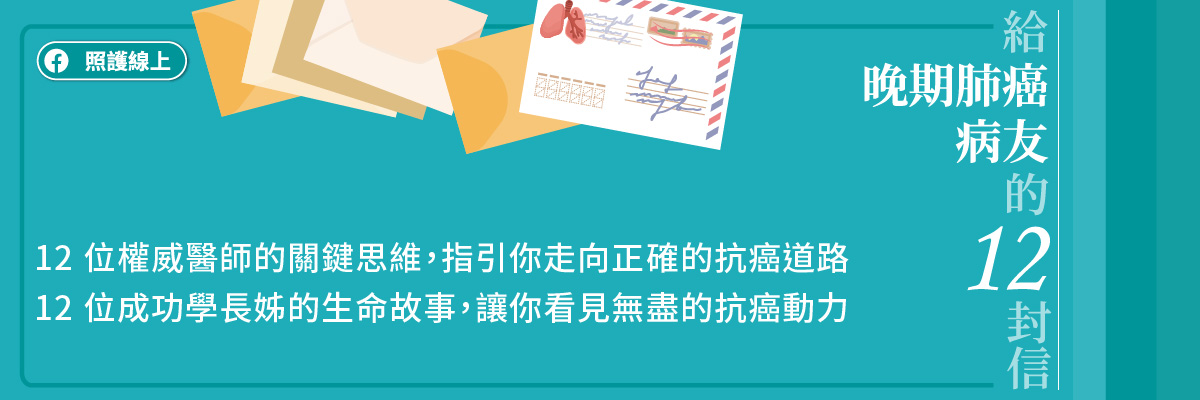 給 每一位剛踏上抗癌路上的鬥士與戰友在三十年前,確診晚期肺癌後,許多病友都會選擇回家不做治療,但是三十年後的今天,狀況已是截然不同,我們現在已經有很好的治療工具,在確定診斷以後,只要好好與醫師配合,利…